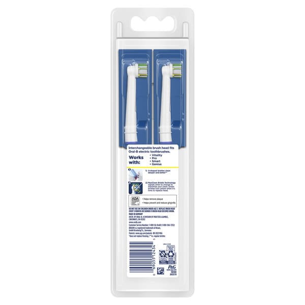 The Oral-B FlossActionX X-Filament Replacement Brush Heads advanced filament technology design was created to brush away plaque. This replacement brush head provides a floss-like clean for healthier gums* with bristles that work to loosen plaque between teeth. Oral-B’s FlossActionX Replacement Brush Head with X-Filament bristles is an ideal addition to your brushing routine because the bristles lift, trap, break up, and remove plaque along the gumline, providing an advanced clean. This dentist-inspired round brush head gives a tooth-by-tooth clean with specially engineered bristles to ensure optimal coverage on every tooth. The Oral-B replacement brush head has indicator bristles that signal when it is time to replace your brush head. Round cleans better** and new cleans best. A new replacement brush head removes more plaque than a worn one. The Oral-B FlossActionX replacement brush head pack includes two genuine Oral-B FlossActionX Replacement Brush Heads with X-Filament bristles. The Oral-B FlossActionX Replacement Brush Heads are compatible with all Oral-B rechargeable toothbrushes, except for Oral-B iO Toothbrushes. Oral-B recommends brushing with Crest Toothpaste for optimal results. Do not use on children under age 3. Replace brush head every three months or sooner if brand head becomes worn. Oral-B: Trust the brand dentists use the most worldwide.****Does not replace flossing.**Vs. a regular manual toothbrush.***Based on surveys of a representative worldwide sample of dentists carried out for P&G regularly.