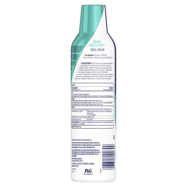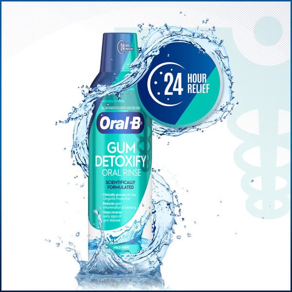 The Oral-B Rinse Collection is crafted to meet your unique oral care needs. Oral-B Gum Detoxify Rinse is clinically proven to provide 24-hour protection against plaque and gingivitis* and help reverse early signs of gum disease. No added alcohol, artificial dyes, gluten, or sodium lauryl sulfate (SLS). *With 2x daily use
