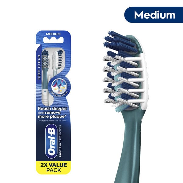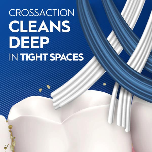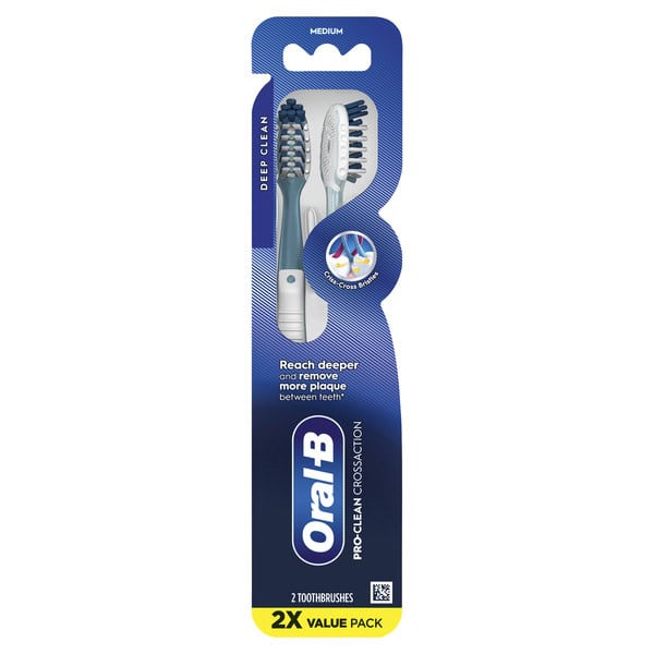 The Oral-B Pro Clean CrossAction toothbrush was designed to deliver a superior deep clean versus an ordinary flat-trim manual toothbrush. CrossAction bristles featured in this Oral-B toothbrush are angled to precisely flex into tough to clean areas and attack plaque with every stroke. This toothbrush also features power tip bristles to reach difficult-to-access areas behind back teeth and in-between the tight areas of your unique teeth. The Oral-B Pro Clean CrossAction manual toothbrush reaches deeper and removes more plaque between teeth.* Gum stimulators along the side of the brush head gently massage your gums. The Pro Clean CrossAction toothbrush includes a tongue and cheek cleaner to remove odor-causing bacteria. This medium bristle toothbrush removes plaque from hard-to-reach areas to improve gum health. Oral-B is the #1 Toothbrush Brand Used by Dentists Worldwide. This pack of Oral-B toothbrushes include different colors of toothbrushes for households with multiple people or stocking up. A new toothbrush cleans 95% better in hard-to-reach areas**, remember to change your toothbrush every 3 months. *vs. a regular manual toothbrush **vs. one 3 months old; research with a flat trim toothbrush
