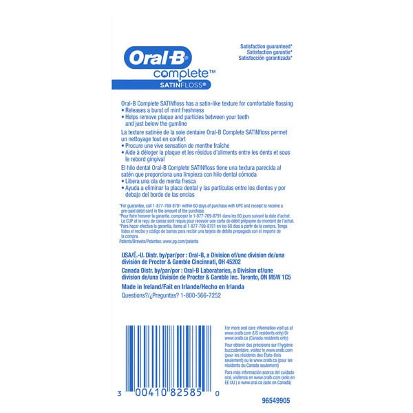 Oral-B Complete Satin Floss has a satin-like texture for comfortable flossing that helps remove plaque and particles between your teeth and just below the gum line. Satisfaction Guaranteed, or your money back. For guarantee, call 1-877-769-8791 within 60 days of purchase with UPC and receipt.