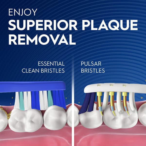 The Oral-B Expert Clean Pulsar toothbrush is battery operated and provides superior plaque removal with micro-pulse bristle vibrations versus a regular manual toothbrush. The vibrating bristles on this toothbrush help break up plaque between teeth. The split head design moderates the amount of pressure applied to your teeth and gums. Power tip bristles on the toothbrush head reach deeper and provide a precision clean behind teeth. Oral-B is the #1 Toothbrush Brand Used by Dentists Worldwide. This pack of Oral-B toothbrushes include different colors of toothbrushes for households with multiple people or stocking up. A new toothbrush cleans 95% better in hard-to-reach areas*, remember to change your toothbrush every 3 months. *vs one 3 months old; research with a flat trim toothbrush