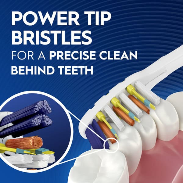 • Power tip bristles reach deep providing a precision clean behind teeth