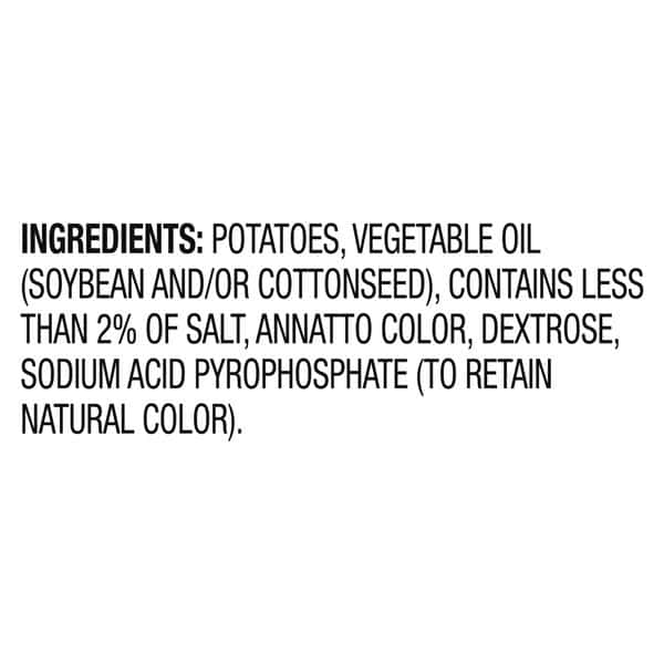 Potatoes, Vegetable Oil (sunflower, Cottonseed, Soybean, And/or Canola), Salt, Dextrose, Disodium Dihydrogen Pyrophosphate (to Retain Natural Color), Annatto (vegetable Color).