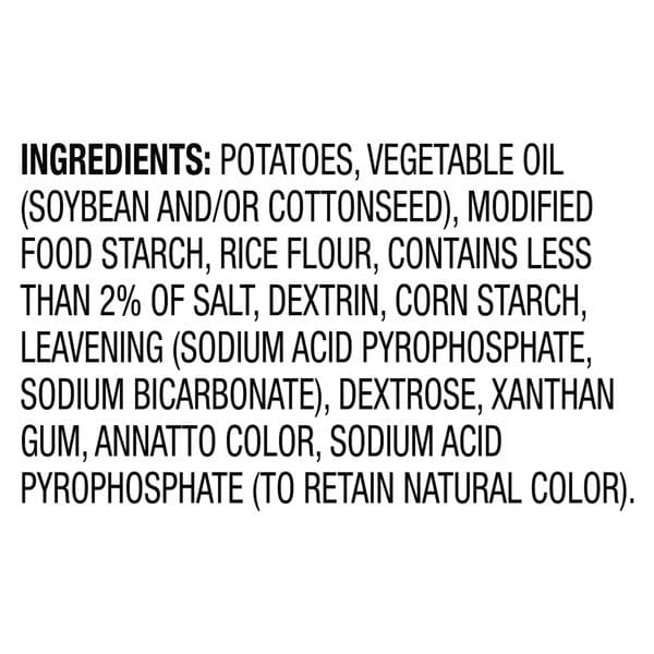 Potatoes, Vegetable Oil (soybean And/or Cottonseed), Modified Food Starch, Rice Flour, Contains Less Than 2% Of Salt, Dextrin, Corn Starch, Leavening (sodium Acid Pyrophosphate, Sodium Bicarbonate), Dextrose, Xanthan Gum, Annatto Color, Sodium Acid Pyrophosphate (to Retain Natural Color)