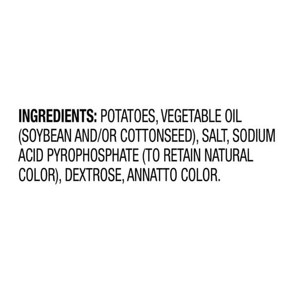 Potatoes, Vegetable Oil (soybean And/or Cottonseed), Salt, Sodium Acid Pyrophosphate (to Retain Natural Color), Dextrose, Annatto Color