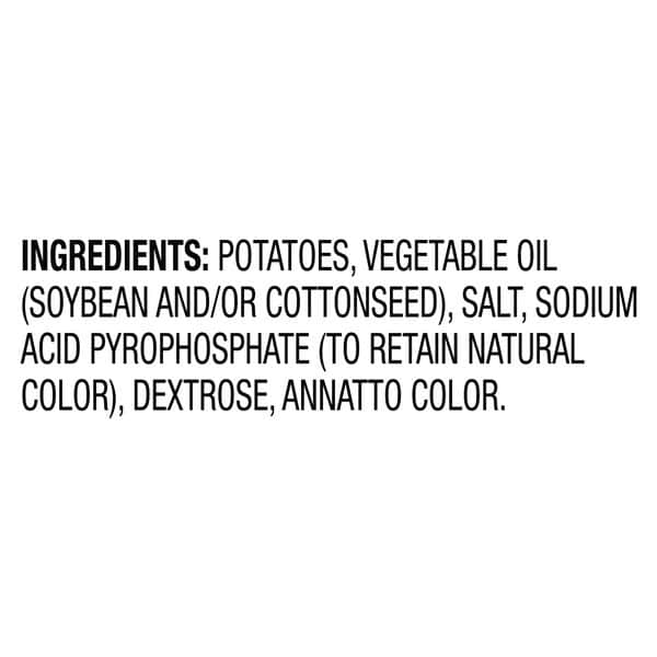 Potatoes, Vegetable Oil Blend (soybean And Cottonseed), Salt, Annatto Color, Dextrose, Sodium Acid Pyrophosphate.