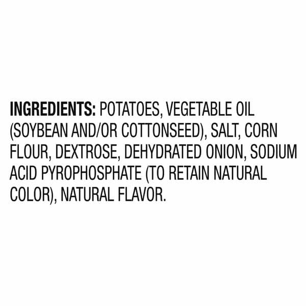 Potatoes, Vegetable Oil (soybean And/or Cottonseed), Salt, Corn Flour, Dextrose, Dehydrated Onion, Sodium Acid Pyrophosphate (to Retain Natural Color), Natural Flavor