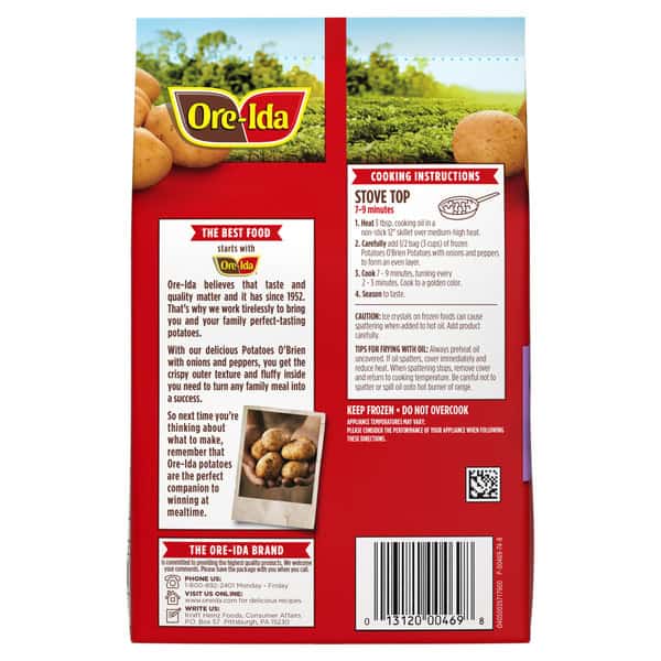 Crispy outside, fluffy inside, every time. Deliciously predictable, that’s Ore-Ida. Ore-Ida Potatoes O’Brien With Onions and Peppers saves you time on prep with a delicious frozen dish that’s ready to cook. Crispy and golden, our frozen Potatoes O’Brien are made with bell peppers and onions added for a balance of flavors. Gluten-free skillet potatoes contain 0 grams of trans fat per serving as packaged. Simply cook in a skillet with a little oil according to the package directions to get a perfectly crispy, easy side dish for your next family meal. The chunks of potatoes make the perfect addition to your breakfast along with eggs and bacon. Comes sealed in a 28-ounce bag for easy storage in your freezer. Ore-Ida believes that taste and quality matter and it has since 1952. That’s why we work tirelessly to bring you and your family perfect-tasting potatoes.