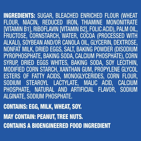 Sugar, Bleached Enriched Flour (wheat Flour, Niacin, Reduced Iron, Thiamine Mononitrate [vitamin B1], Riboflavin [vitamin B2], Folic Acid), Palm Oil, Fructose, Cornstarch, Water, Cocoa (processed With Alkali), Soybean And/or Canola Oil, Glycerin, Dextrose, Nonfat Milk, Dried Eggs, Salt, Baking Powder (disodium Pyrophosphate, Baking Soda, Calcium Phosphate), Corn Syrup, Dried Eggs Whites, Baking Soda, Soy Lecithin, Modified Corn Starch, Xanthan Gum, Propylene Glycol Esters Of Fatty Acids, Monoglycerides, Corn Flour, Sodium Stearoyl Lactylate, Malic Acid, Calcium Phosphate, Natural And Artificial Flavor, Sodium Alginate, Sodium Phosphate.