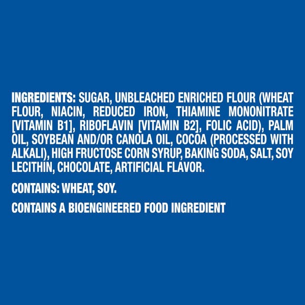 Sugar, Unbleached Enriched Flour (wheat Flour, Niacin, Reduced Iron, Thiamine Mononitrate [vitamin B1], Riboflavin [vitamin B2], Folic Acid), Palm Oil, Soybean And/or Canola Oil, Cocoa (processed With Alkali), High Fructose Corn Syrup, Baking Soda, Salt, Soy Lecithin, Chocolate, Artificial Flavor.