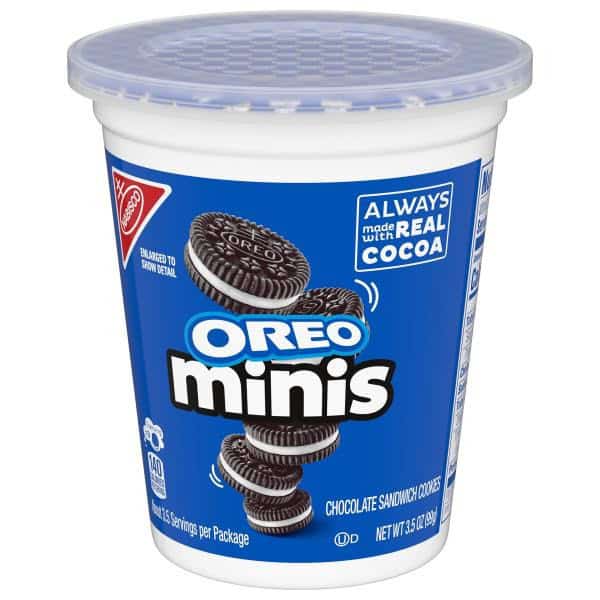 • One 3.5 oz snack cup of OREO Minis Chocolate Sandwich Cookies (packaging may vary).