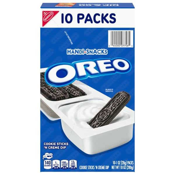 Oreo Cookie Sticks: Unbleached Enriched Flour (wheat Flour, Niacin, Reduced Iron, Thiamine Mononitrate [vitamin B1], Riboflavin [vitamin B2], Folic Acid), Sugar, Canola Oil, Cocoa (processed With Alkali), High Fructose Corn Syrup, Baking Soda, Salt, Soy Lecithin, Chocolate, Artificial Flavor, Creme Dip: Sugar, Canola And/or Palm And/or Palm Kernel Oil, Titanium Dioxide (artificial Color), Soy Lecithin, Artificial Flavor.