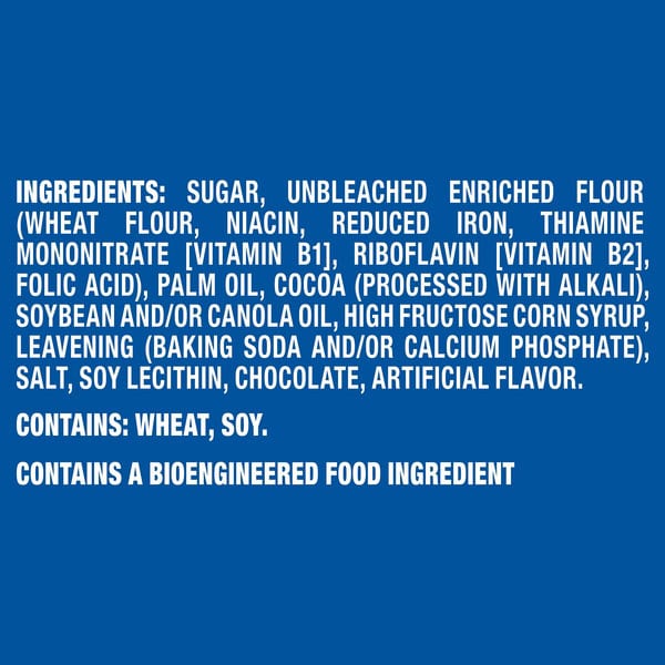 Sugar, Unbleached Enriched Flour (wheat Flour, Niacin, Reduced Iron Thiamine Mononitrate [vitamin B1], Riboflavin [vitamin B2] Folic Acid), Palm Oil, Cocoa (processed With Alkali), Soybean And/or Canola Oil, High Fructose Corn Syrup, Leavening (baking Soda And/or Calcium Phosphate), Salt, Soy Lecithin, Chocolate, Artificial Flavor
