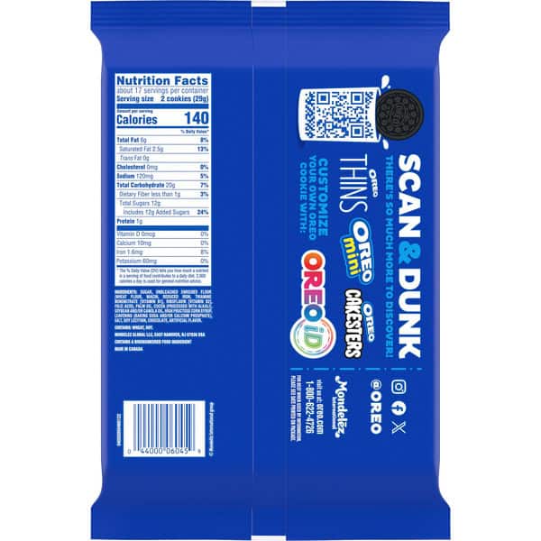 Take a delicious break with OREO Dark Chocolate Creme Chocolate Sandwich Cookies. Supremely dunkable, dark chocolate OREO cookies sandwich dark chocolate creme filling between two Always Made with Real Cocoa chocolate wafers making them milk’s favorite cookie. OREO chocolate sandwich cookies are great for serving as a dessert, with ice cream, as party snacks or for packing sweet snacks with lunch at school or work. You can even mix these bulk snack cookies into your favorite dessert recipe or cheesecake recipe for something a little extra special. The resealable pack of OREO cookies with easy-pull tab keeps dark chocolate cookies fresh and ready to share.