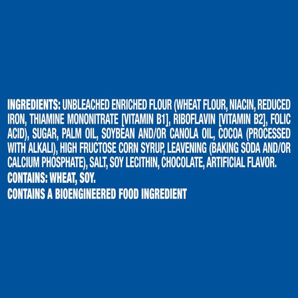 Unbleached Enriched Flour (wheat Flour, Niacin, Reduced Iron, Thiamine Mononitrate [vitamin B1], Riboflavin [vitamin B2], Folic Acid), Sugar, Palm Oil, Soybean And/or Canola Oil, Cocoa (processed With Alkali), High Fructose Corn Syrup, Leavening (baking Soda And/or Calcium Phosphate), Salt, Soy Lecithin, Chocolate, Artificial Flavor.
