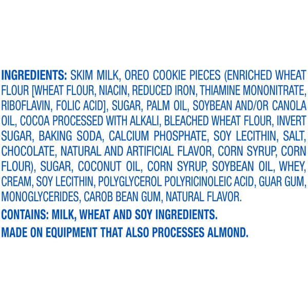 Skim Milk, Oreo Cookie Pieces (enriched Wheat Flour [wheat Flour, Niacin, Reduced Iron, Thiamine Mononitrate, Riboflavin, Folic Acid], Sugar, Palm Oil, Soybean And/or Canola Oil, Cocoa Processed With Alkali, Invert Sugar, Baking Soda, Calcium Phosphate, Soy Lecithin, Salt, Chocolate, Natural Flavor), Sugar, Coconut Oil, Corn Syrup, Soybean Oil, Whey, Cream, Soy Lecithin, Polyglycerol Polyricinoleic Acid, Guar Gum, Monoglycerides, Carob Bean Gum, Natural Flavor