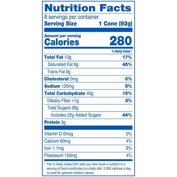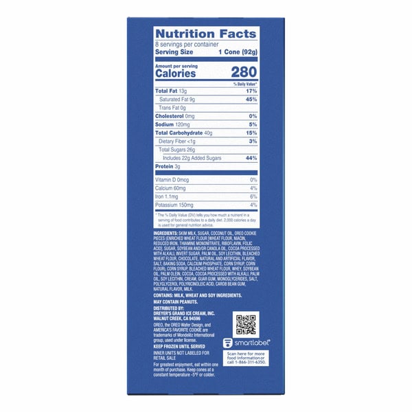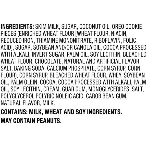 Dairy Product Solids, Sugar, Skim Milk, Chocolate Cone (bleached Wheat Flour, Sugar, Cocoa Processed With Alkali, Vegetable Shortening [soybean Oil, Palm Oil, Soy Lecithin], Salt), Corn Syrup, Oreo Cookie Pieces (unbleached Enriched Flour [wheat Flour, Niacin, Reduced Iron, Thiamine Mononitrate, Riboflavin, Folic Acid], Sugar, Canola Oil, Cocoa Processed With Alkali, High Fructose Corn Syrup, Invert Sugar, Soy Lecithin, Palm Oil, Chocolate, Natural And Artificial Flavor, Salt, Leavening [baking Soda And/or Calcium Phosphate]), Coconut Oil, Cream, Maltodextrin, Soybean Oil, Palm Olein, Cocoa, Propylene Glycol Monostearate, Cellulose Gel, Guar Gum, Monoglycerides, Palm Oil, Soy Lecithin, Carob Bean Gum, Polyglycerol Polyricinoleic Acid, Natural Flavor, Cellulose Gum.