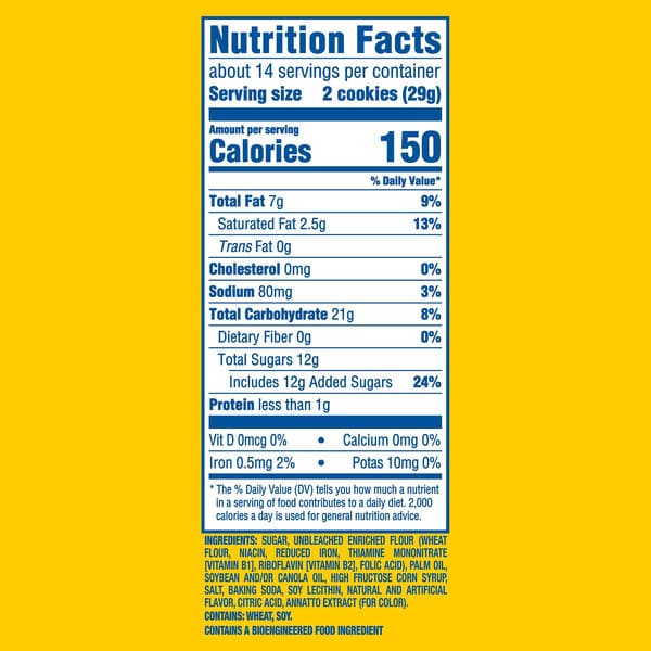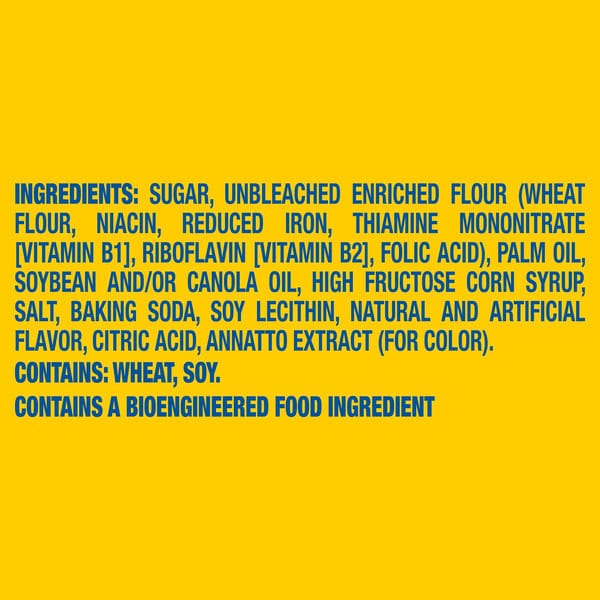 Sugar, Unbleached Enriched Flour Wheat Flour, Niacin, Reduced Iron, Thiamine Mononitrate [vitamin B1], Riboflavin [vitamin B2], Folic Acid), Palm Oil, Soybean And/or Canola Oil, High Fructose Corn Syrup, Salt, Baking Soda, Soy Lecithin, Natural And Artificial Flavor, Citric Acid, Annatto Extract (for Color).