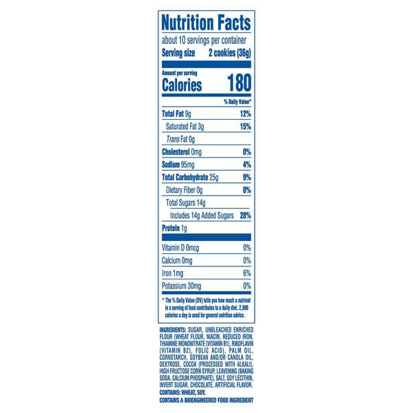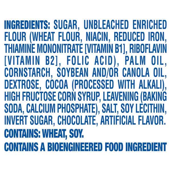 Sugar, Unbleached Enriched Flour (wheat Flour, Niacin, Reduced Iron Thiamine Mononitrate [vitamin B1], Riboflavin [vitamin B2], Folic Acid), Palm Oil Cornstarch, Soybean And/or Canola Oil, Dextrose, Cocoa (processed With Alkali) High Fructose Corn Syrup, Leavening (baking Soda, Calcium Phosphate), Salt, Soy Lecithin, Invert Sugar, Chocolate, Artificial Flavor.