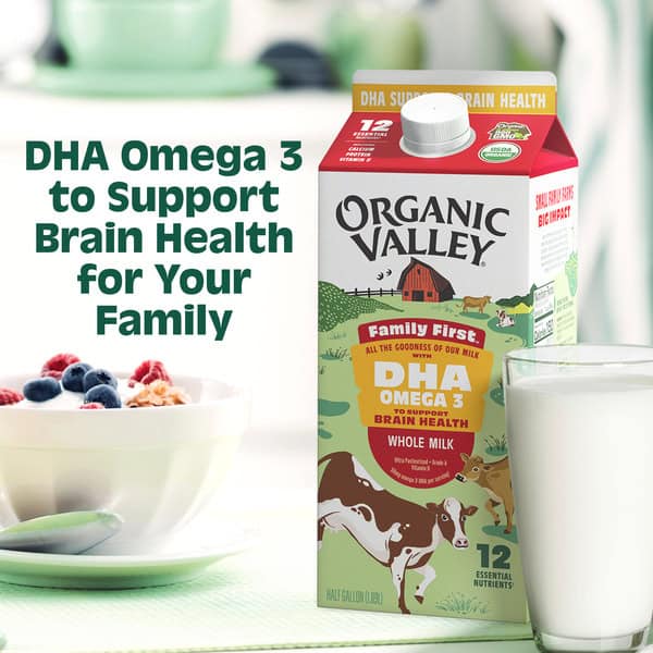 A milk of the ages! Everyone at the table will enjoy the goodness of Organic Valley Whole Organic Milk with DHA. The same rich & delicious taste and 12 essential nutrients of Organic Valley Whole milk PLUS the benefits of DHA – an Omega-3 fatty acid to support brain health. Organic Valley milk is certified organic, and is always non-GMO.
