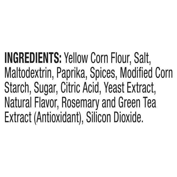 Yellow Corn Flour, Salt, Maltodextrin, Paprika, Spices, Modified Corn Starch, Sugar, Garlic Powder, Citric Acid, Yeast Extract, Natural Flavor, Silicon Dioxide.