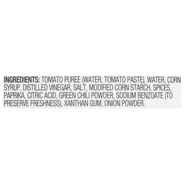 Tomato Puree (water, Tomato Paste), Water, Corn Syrup, Distilled Vinegar, Salt, Modified Corn Starch, Spices, Paprika, Citric Acid, Green Chili Powder, Sodium Benzoate (to Preserve Freshness), Xanthan Gum, Onion Powder.