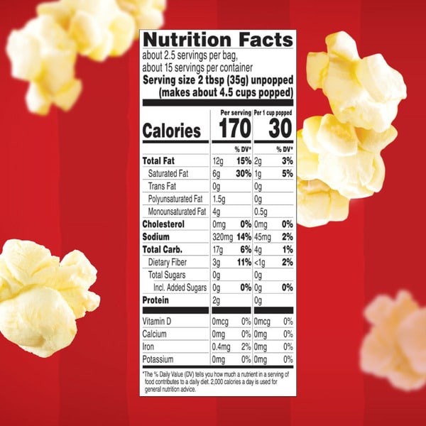 Whole Grain Popping Corn, Palm Oil, Salt, Natural Flavors, Mixed Tocopherols (vitamin E For Freshness), Butter, Color Added (annatto).