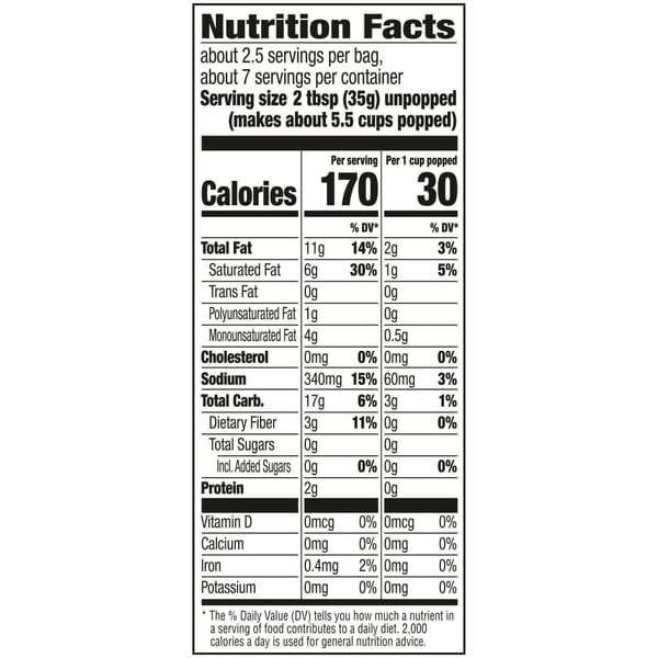 Whole Grain Popping Corn, Palm Oil, Salt, Natural Flavor (including Milk), Color Added (annatto), Mixed Tocopherols (vitamin E For Freshness).