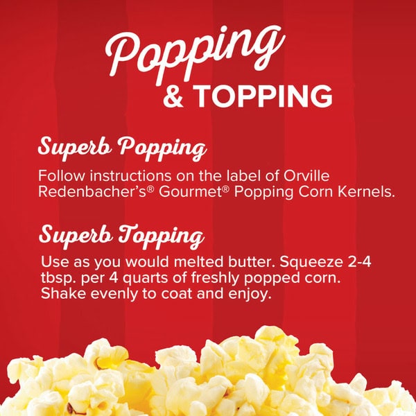 For Superb Popping: Follow instructions on the label of Orville Redenbacher’s Gourmet Popping Corn Kernels. For Superb Topping: Use as you would melted butter. Squeeze 2-4 tbsp. per 4 quarts of freshly popped corn. Shake evenly to coat and enjoy.