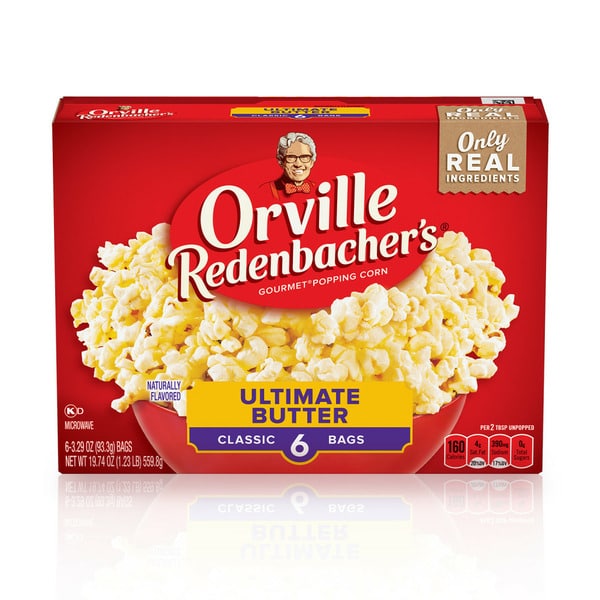 Orville Redenbacher’s Ultimate Butter Popcorn is a delicious and premium microwave popcorn loaded with butter flavor. Rich and buttery, this microwave popcorn is great when you’re craving a popcorn snack. It is light and fluffy, with a delicious crunch. Orville Redenbacher’s Ultimate Butter Flavored Popcorn is made with 100% whole grain gourmet popcorn kernels and can be enjoyed as gluten free snacks. Made with only 100% real ingredients from natural sources, this popcorn snack contains no artificial preservatives, no flavors and no dyes. Ready in minutes, simply follow the directions on the microwavable popcorn bags for warm, freshly popped salty snacks. Explore Orville Redenbacher’s other microwave popcorn flavors, popcorn seasoning and kernels for a gourmet popcorn experience. Orville Redenbacher’s isn’t just a name, it’s a promise of excellence and authenticity.
