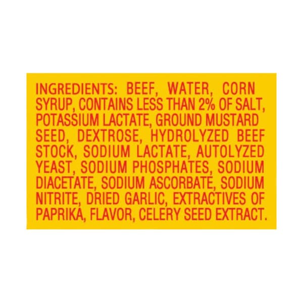 Beef, Water, Corn Syrup, Contains Less Than 2% Of Salt, Ground Mustard Seed, Potassium Lactate, Dextrose, Hydrolyzed Beef Stock, Sodium Lactate, Autolyzed Yeast, Sodium Phosphates, Sodium Diacetate, Sodium Ascorbate, Sodium Nitrite, Flavor, Extractives Of Paprika, Oleoresin Celery Seed.