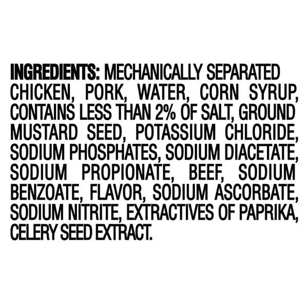 Mechanically Separated Chicken, Pork, Water, Corn Syrup, Contains Less Than 2% Of Salt, Ground Mustard Seed, Potassium Chloride, Sodium Phosphates, Sodium Diacetate, Sodium Propionate, Beef, Sodium Benzoate, Flavor, Sodium Ascorbate, Sodium Nitrite, Extractives Of Paprika, Celery Seed Extract
