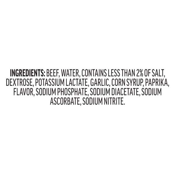 Beef, Water, Contains Less Than 2% Of Salt, Dextrose, Potassium Lactate, Garlic, Corn Syrup, Paprika, Flavor, Sodium Phosphate, Sodium Diacetate, Sodium Ascorbate, Sodium Nitrite