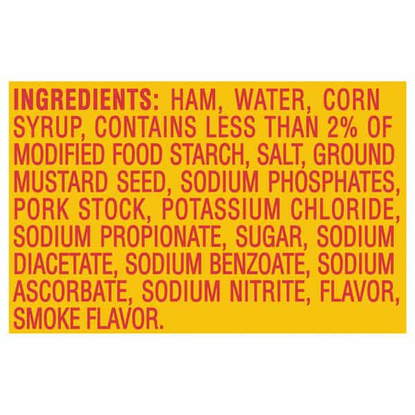 Ham, Water, Corn Syrup , Contains Less Than 2% Of Modified Cornstarch ,salt , Ground Mustard Seed, Pork Stock, Sodium Phosphates, Potassium Chloride, Sodium Propionate, Sugar, Sodium Diacetate, Sodium Benzoate, Sodium Ascorbate, Sodium Nitrite, Dextrose, Flavor , Smoke Flavor, Calcium Phosphate.