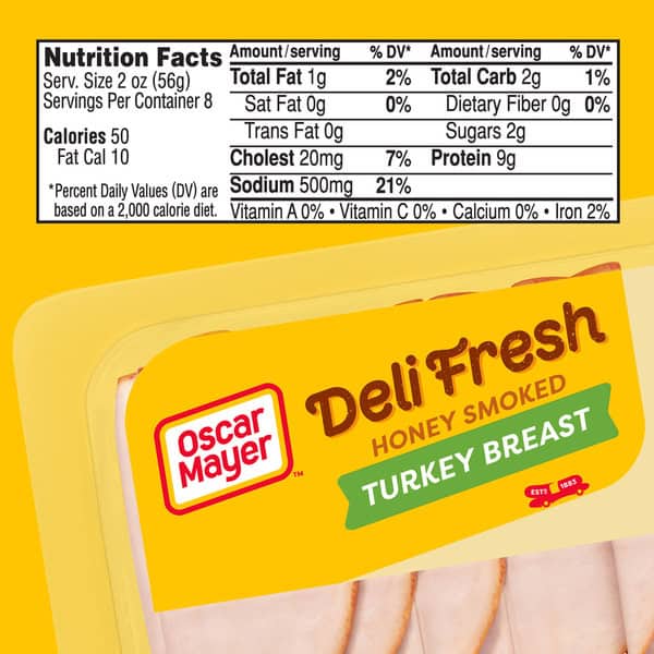 Oscar Mayer Deli Fresh Honey Smoked Turkey Breast Family Size Tray contains quality deli turkey meat with no artificial preservatives, no nitrates or nitrites added, and no added hormones. This turkey sandwich meat is fully cooked, and has a mouthwatering smoky flavor with a touch of sweet honey. Oscar Mayer Deli Fresh makes the perfect lunch – use smoked turkey slices to make a classic turkey sub sandwich, or try making a turkey club. Honey smoked turkey also makes a great addition to cheese and crackers or salads. Keep the 16 ounce tray refrigerated to maintain freshness.
