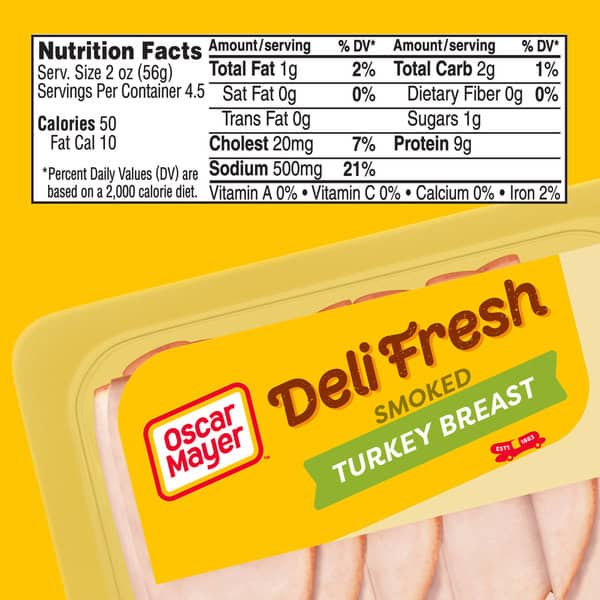 Oscar Mayer Deli Fresh Smoked Turkey Breast is quality turkey deli meat with no artificial preservatives, no added hormones and no nitrates or nitrites added. This turkey lunch meat is fully cooked, and it has a mouthwatering smoky flavor perfect for a classic turkey sandwich. Oscar Mayer Deli Fresh makes the perfect lunch – use slices of smoked turkey to make a turkey and cheese sandwich, or try making a turkey melt in the oven. Oscar Mayer Deli Fresh Smoked Turkey Breast also makes a great addition to cheese and crackers or a Cobb salad. Keep the 9 ounce tray refrigerated to maintain freshness.
