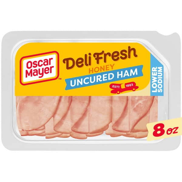 • One 8 oz tray of Oscar Mayer Deli Fresh Honey Uncured Ham with Natural Juices Browned with Caramel Color Sliced Lunch Meat with 27% Lower Sodium than USDA data for cooking smoked honey ham, 8 oz tray.