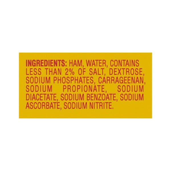 Ham, Water, Contains Less Than 2% Of Salt, Dextrose, Sodium Phosphates, Carrageenan, Sodium Propionate, Sodium Diacetate, Sodium Benzoate, Sodium Ascorbate, Sodium Nitrite