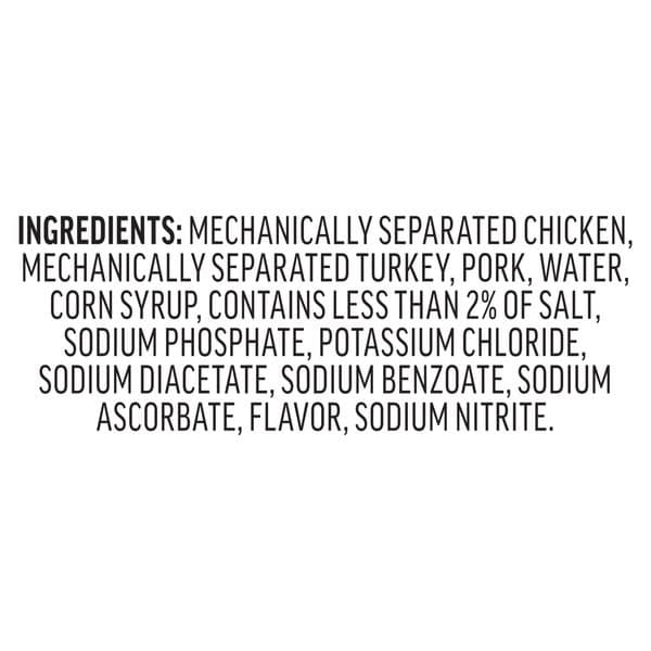 Mechanically Separated Chicken, Mechanically Separated Turkey, Pork, Water, Corn Syrup, Contains Less Than 2% Of Salt, Sodium Phosphate, Potassium Chloride, Sodium Diacetate, Sodium Benzoate, Sodium Ascorbate, Flavor, Sodium Nitrite