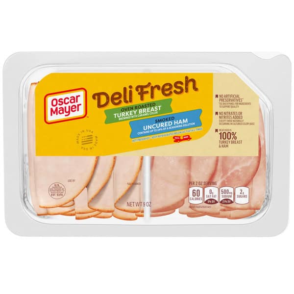 • One 9 oz tray of Oscar Mayer Deli Fresh Oven Roasted Turkey Breast & Smoked Uncured Ham Sliced Lunch Meat Variety Pack No Nitrates Or Nitrites Added Except Those Naturally Occurring In Cultured Celery Juice
