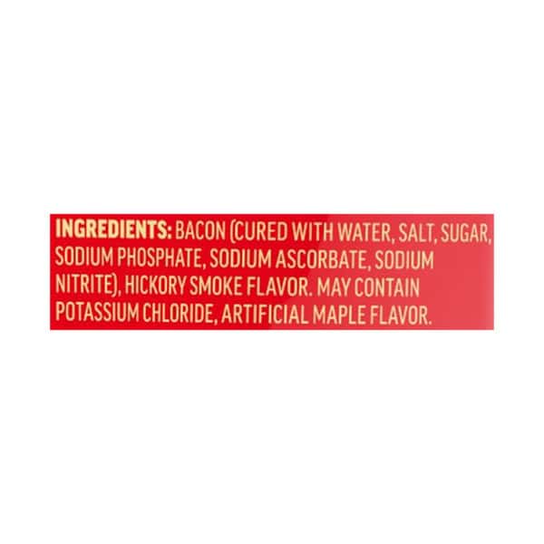 Bacon (cured With Water, Sugar, Sodium Phosphates, Sodium Ascorbate, Sodium Mitrite, May Also Contain: Salt, Sea Salt, Potassium Chloride, Artificial Maple Flavor [artificial Maple Flavor, Corn Syrup, Water, Caramel Color]), Hickory Smoke Flavor.