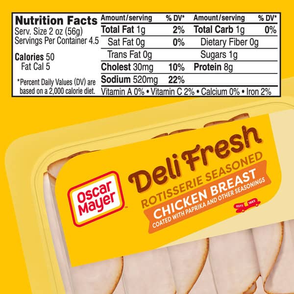 Make a delicious deli sandwich at home with Oscar Mayer Deli Fresh Rotisserie Seasoned Chicken Breast, Coated With Paprika And Other Seasonings. Our quality chicken deli meat is 98% fat-free and made with no artificial preservatives*, no added hormones**, and no added nitrates or nitrites. Fully cooked and ready to eat, our chicken slices are coated with paprika and other seasonings, making them perfect for a sandwich, salad, or cheese and crackers. Oscar Mayer lunch meat is great for those following a low carb lifestyle. Keep our 9 ounce package of deli chicken refrigerated to maintain freshness. If you enjoy our rotisserie chicken lunch meat, try our honey ham or turkey as well as many other varieties of deli department cold cuts. *See back panel for ingredients to support quality. **Federal regulations prohibit the use of hormones in poultry.