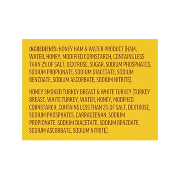 Honey Ham & Water Product (ham, Water, Honey, Modified Cornstarch, Contains Less Than 2% Of Salt, Dextrose, Sugar, Sodium Phosphates, Sodium Propionate, Sodium Diacetate, Sodium Benzoate, Sodium Ascorbate, Sodium Nitrite). Honey Smoked Turkey Breast & White Turkey (turkey Breast, White Turkey, Water, Honey, Modified Cornstarch, Contains Less Than 2% Of Salt, Dextrose, Sodium Phosphates, Carrageenan, Sodium Propionate, Sodium Diacetate, Sodium Benzoate, Sodium Ascorbate, Sodium Nitrite).