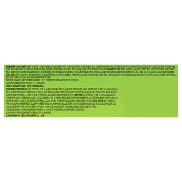 Black Cherry: Water, Sorbitol**, Cherry Puree, Glycerin, Cherry Juice From Concentrate (water, Cherry Juice Concentrate), Grape Juice From Concentrate (water, Grape Juice Concentrate), Maltodextrin§, Polydextrose, Carob Bean Gum, Guar Gum, Citric Acid, Natural Flavor, Ascorbic Acid (vitamin C), Vegetable Juice Color§, Sucralose, Acesulfame Potassium. Strawberry Kiwi: Water, Sorbitol**, Kiwi Puree, Grape Juice From Concentrate (water, Grape Juice Concentrate), Glycerin, Strawberry Puree, Strawberries, Maltodextrin§, Polydextrose, Citric Acid, Natural Flavor, Carob Bean Gum, Guar Gum, Ascorbic Acid (vitamin C), Vegetable Juice Color, Sucralose, Acesulfame Potassium. Mixed Berry: Water, Sorbitol**, Blueberry Puree, Strawberry Puree, Glycerin, Blackberry Puree, Maltodextrin§, Polydextrose, Lemon Juice From Concentrate [water, Lemon Juice Concentrate], Natural Flavor, Ascorbic Acid (vitamin C), Guar Gum, Sucralose, Carob Bean Gum, Acesulfame Potassium. **sensitive Individuals May Experience A Laxative Effect From Excess Consumption Of This Ingredient. §contributes Insignificant Amounts Of Total Sugars.