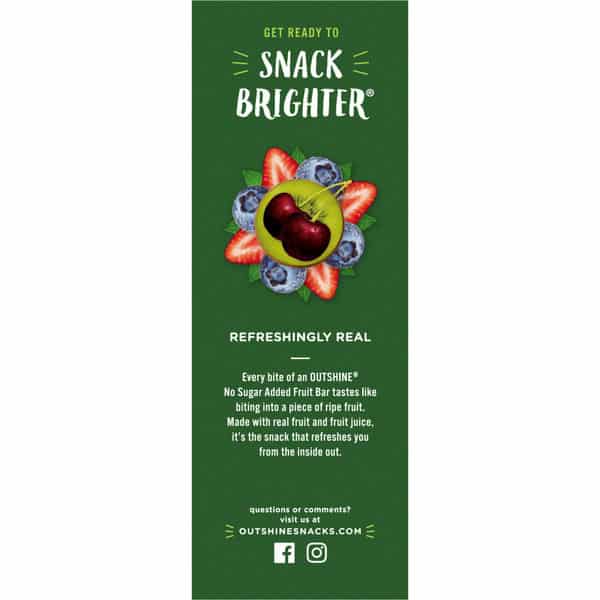 Outshine No Sugar Added Black Cherry, Strawberry Kiwi, and Mixed Berry Frozen Fruit Bars are a refreshing frozen snack bursting with three delicious tropical flavors. Made with real fruit, these gluten free fruit bars are a good source of Vitamin C for a great tasting snack. This tasty frozen snack contains no artificial flavors and no high fructose corn syrup. Enjoy these wholesome Outshine bars any time of day, whether you want a feel-good tropical snack or need a little afternoon pick-me-up. Outshine proudly offers refreshingly delicious frozen fruit bars for a snack that helps you shine brighter. Try the whole range of Outshine Frozen Fruit Bars to find your new favorite summertime snack or after-dinner delight. Choose from fruit bars, fruit bars with no sugar added, variety packs, and more. You can even mix and match your favorite Outshine Fruit Bars in a blender (remember to remove the sticks!) to make deliciously refreshing mocktails that are sure to cool down any hot afternoon. With many real fruit flavors to choose from including strawberry, black cherry, tangerine, mixed berry, and more, the possibilities are endless!