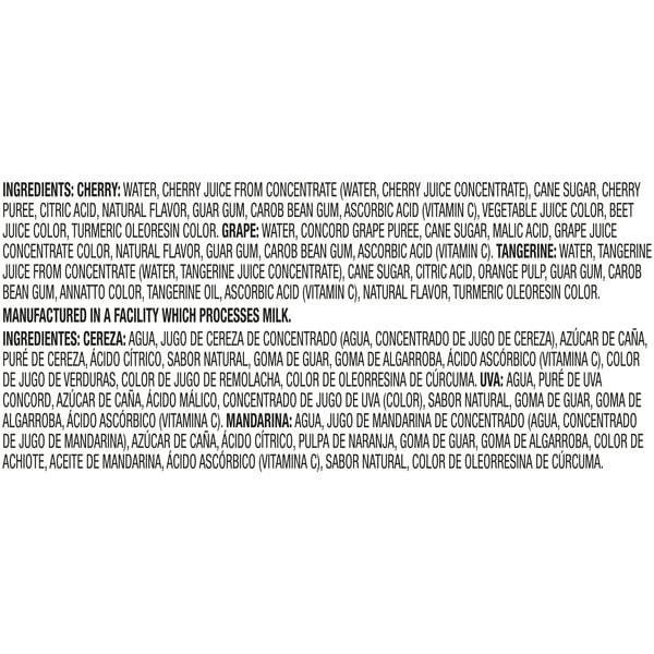 Cherry: Water, Cherry Juice From Concentrate (water, Cherry Juice From Concentrate), Cane Sugar, Cherry Puree, Natural Flavor, Citric Acid, Guar Gum, Carob Bean Gum, Ascorbic Acid (vitamin C), Vegetable Juice Color, Beet Juice Color, Tumeric Oleoresin Color. Grape: Water, Concord Grape Puree, Cane Sugar, Grape Juice Concentrate Color, Malic Acid, Natural Flavor, Guar Gum, Carob Bean Gum, Ascorbic Acid (vitamin C). Tangerine: Water, Tangerine Juice From Concentrate (water, Tangerine Juice Concentrate), Cane Sugar, Citric Acid, Orange Pulp, Guar Gum, Carob Bean Gum, Annatto Color, Tangerine Oil, Ascorbic Acid (vitamin C), Natural Flavor, Turmeric Oleoresin Color.