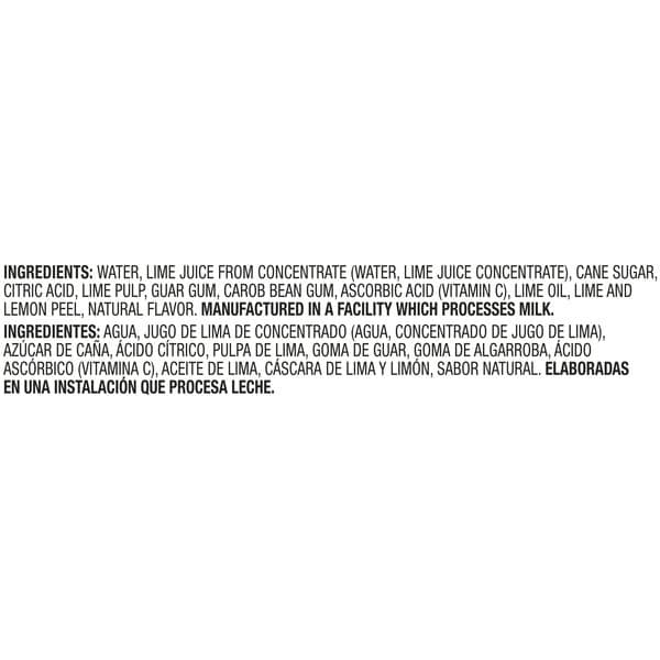 Water, Lime Juice From Concentrate (water, Lime Juice Concentrate), Cane Sugar, Citric Acid, Lime Pulp, Guar Gum, Carob Bean Gum, Ascorbic Acid (vitamin C), Lime Oil, Lime And Lemon Peel, Natural Flavor