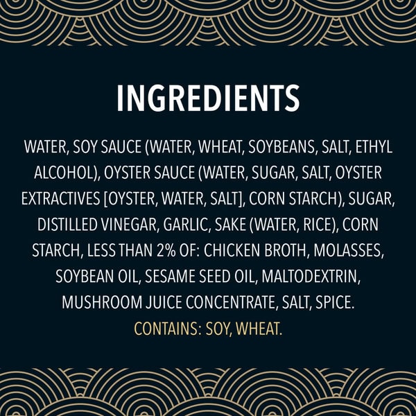 Water, Soy Sauce (water, Wheat, Soybeans, Salt, Ethyl Alcohol), Oyster Sauce (water, Sugar, Salt, Oyster Extractives [oyster, Water, Salt], Corn Starch), Sugar, Distilled Vinegar, Garlic, Sake (water, Rice), Corn Starch, Less Than 2% Of: Molasses, Soybean Oil, Chicken Broth, Sesame Seed Oil, Maltodextrin, Mushroom Juice Concentrate, Salt, Spice.