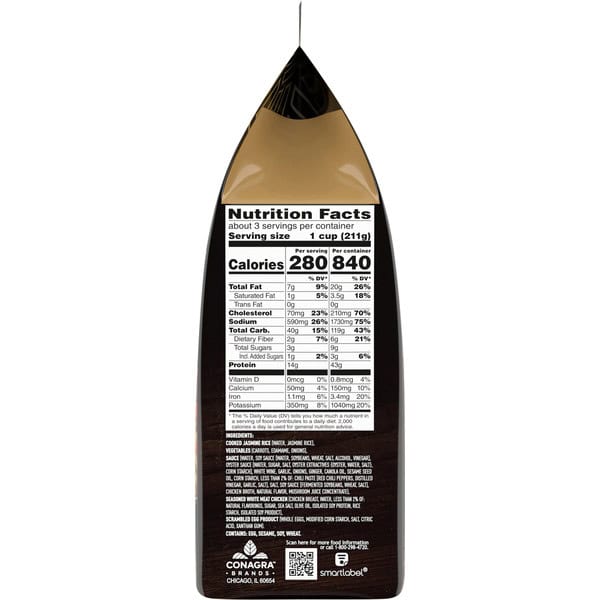 Cooked Jasmine Rice (water, Jasmine Rice), Vegetables (carrots, Edamame, Onions), Sauce [water, Soy Sauce [water, Soybeans, Wheat, Salt, Alcohol, Vinegar], Oyster Sauce [water, Sugar, Salt, Oyster Extractives {oyster, Water, Salt}, Corn Starch], White Wine, Garlic, Onions, Ginger, Canola Oil, Sesame Seed Oil, Corn Starch, Less Than 2% Of: Chili Paste [red Chili Peppers, Distilled Vinegar, Garlic, Salt], Salt, Soy Sauce [fermented Soybeans, Wheat, Salt], Chicken Broth, Natural Flavor, Mushroom Juice Concentrate], Seasoned White Meat Chicken (chicken Breast, Water, Less Than 2% Of: Natural Flavorings, Sugar, Sea Salt, Olive Dil, Isolated Soy Protein, Rice Starch, Isolated Soy Product), Scrambled Egg Product (whole Eggs, Modified Corn Starch, Salt, Citric Acid, Xanthan Gum)