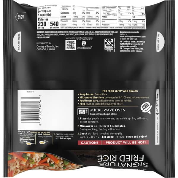 Microwave Oven: Cook only one bag at a time. 1. Place rice pouch in microwave, seam side up. Bag self-vents, do not puncture. 2. Microwave on high 5 to 5-1/2 minutes. During cooking, the bag will inflate. 3. Check that food is cooked thoroughly. Careful, it’s hot! Let stand 1 minute; serve and enjoy! Stove Top: Cook only one bat at a time. 1. Heat large non-stick skillet over medium-high heat until hot, about 2 minutes. Add 2 teaspoons vegetable oil and rice to skillet. 2. Cook 5 minutes, stirring occasionally. 3. Check that food is cooked thoroughly. Careful, it’s hot! Serve and enjoy! For Food Safety and Quality: Keep frozen. Do no thaw. Microwave directions developed with 1100-watt microwave ovens. Appliances vary. Adjust cooking times as needed. Food must be cooked thoroughly to 165 degrees F. Caution! Product will be hot! Lay flat when microwaving.